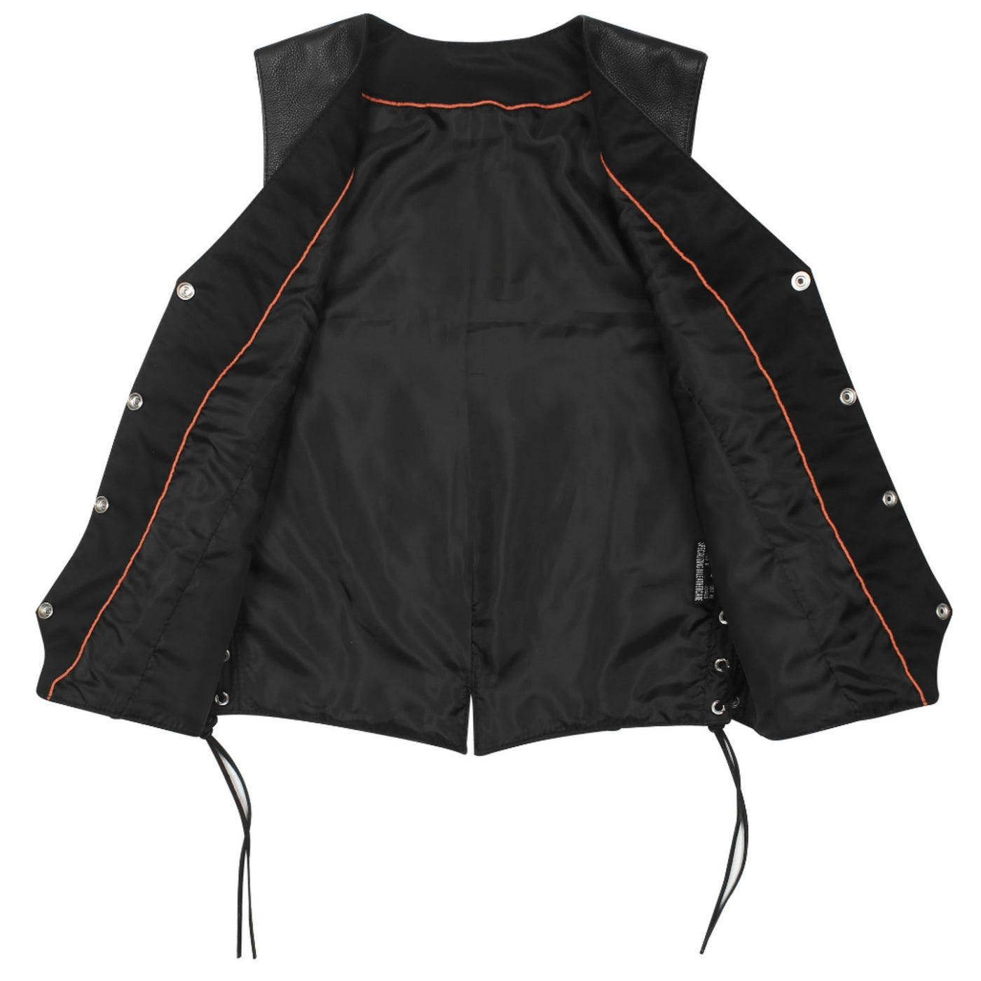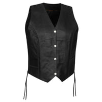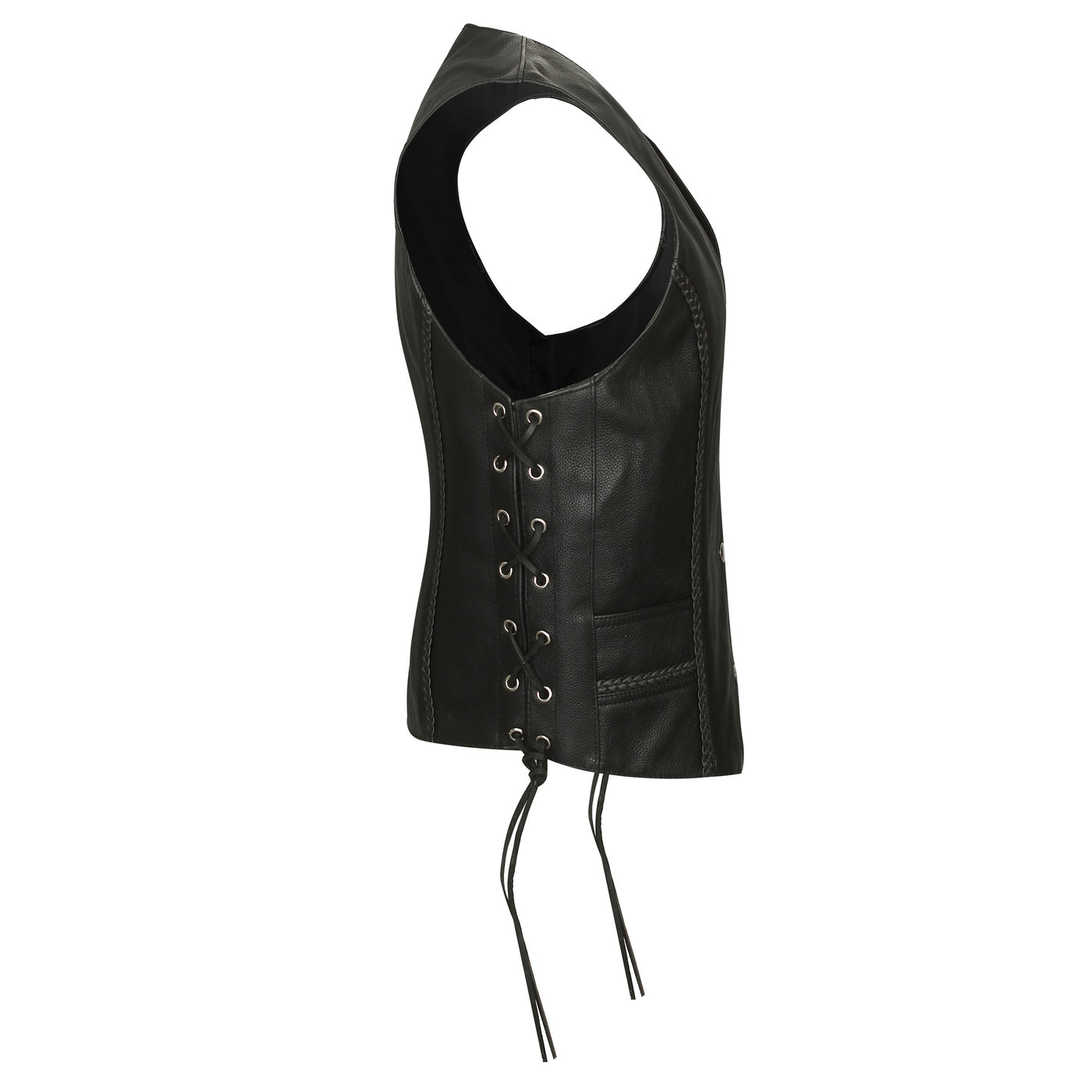 Forged for the bold and built to lead, the Vanguard Valkyrie Leather Vests for Women is a leather vest that blends battlefield utility with timeless feminine power. Crafted from soft, yet durable 0.9–1.0mm milled cowhide leather, this V-neck vest features thick, braided detailing along the front and back — adding depth and classic texture to a commanding silhouette. Side laces allow for adjustable fit and flair, while the satin liner ensures comfort on and off the road. Two exterior drop pockets and an internal storage pocket provide tactical function without compromising on form. Whether you're carving highways or rallying your crew, the Valkyrie is built to ride with confidence and control.