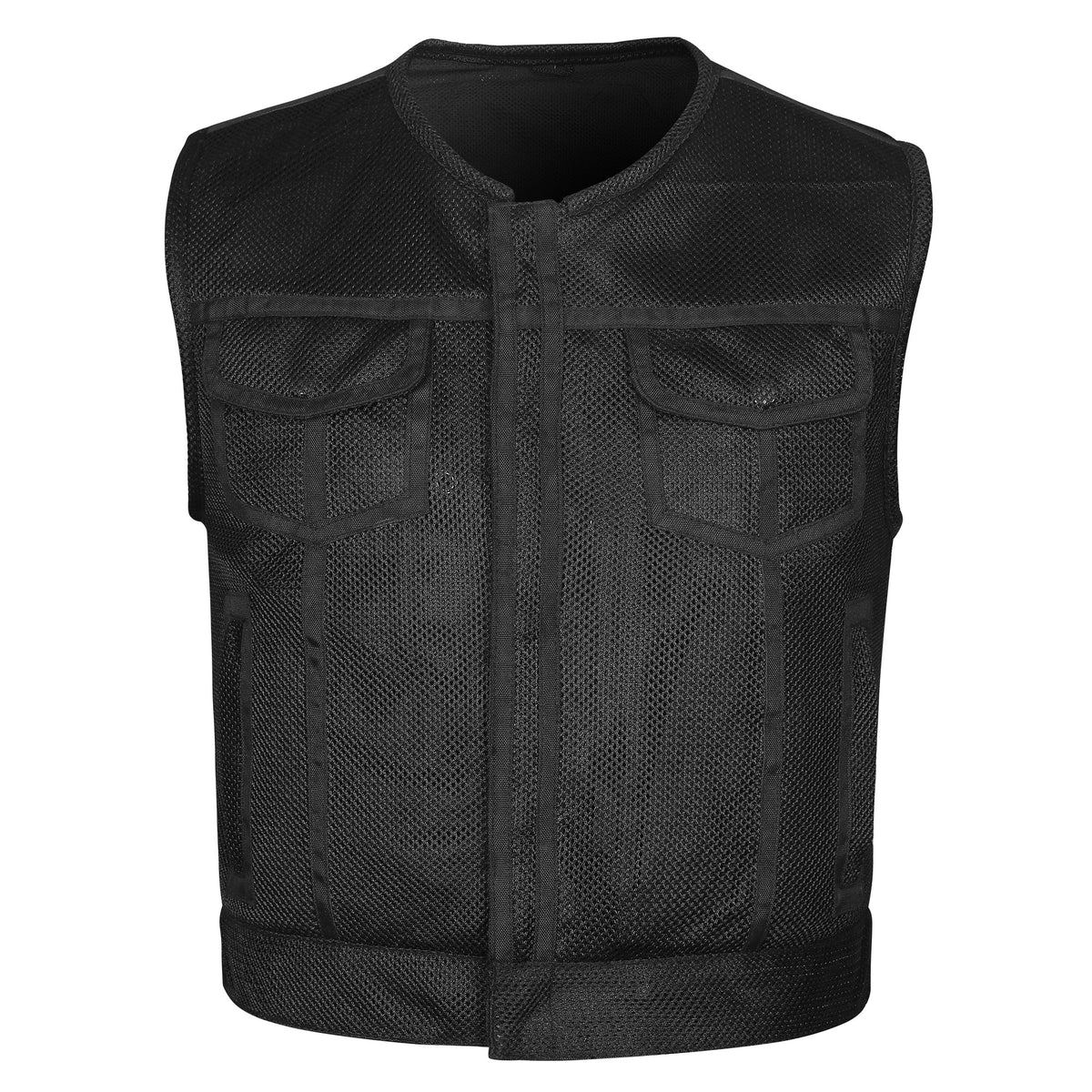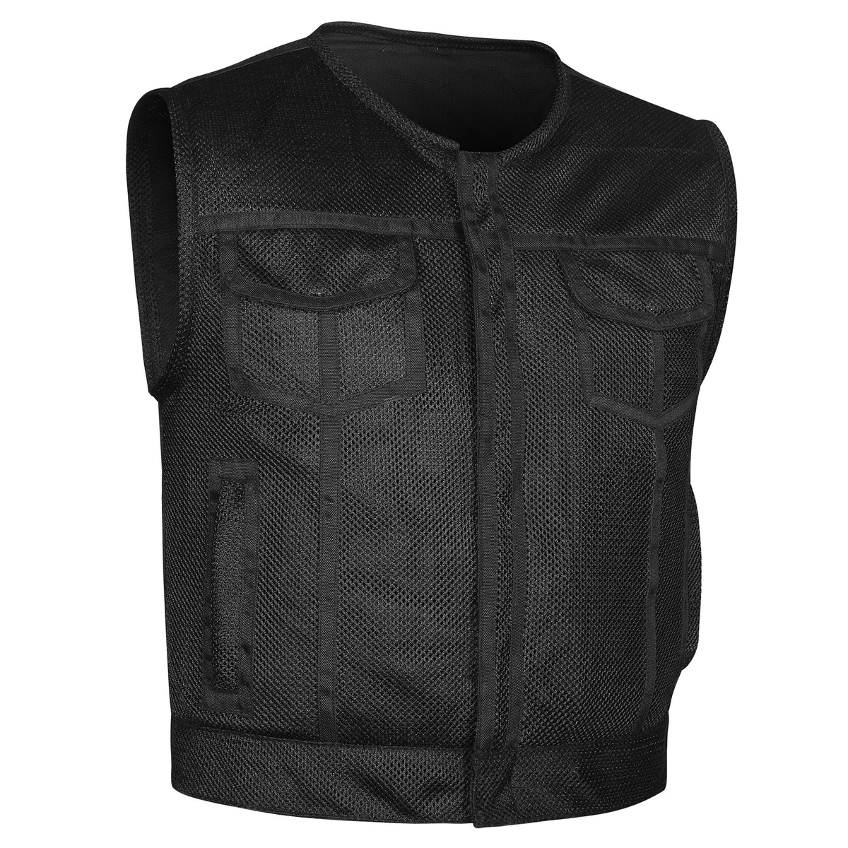 Built for riders who prefer speed, stealth, and heat-tested performance, the Silent Operator Lowcut Moto Mesh Vest is a lightweight tactical essential. Made from ultra-breathable moto mesh and cropped 3 inches shorter than standard club cuts, it delivers an agile fit that’s ideal for warm-weather missions. The cropped snap-and-zipper closure provides wind and rain defense, while reinforced double-stitched shoulders handle the weight of serious concealed carry. Two deep CCW pockets — including one external quick-access location — give you fast, secure access when the moment demands. With its mesh lining, single panel back for club patches, and blackout hardware, the Silent Operator keeps your mission tight and your presence low.
